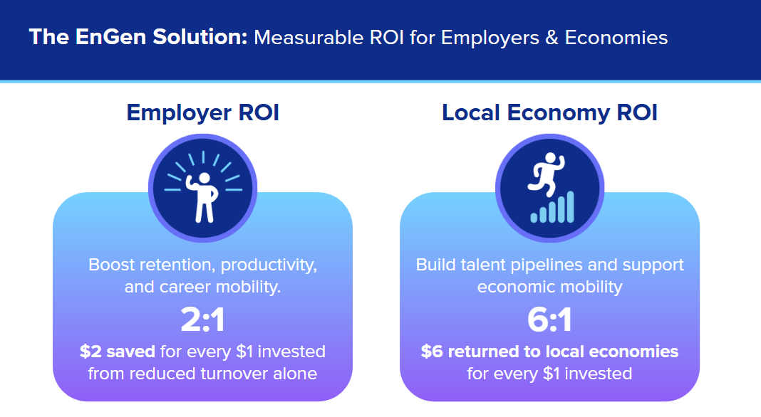 EnGen helps employers and workforce leaders turn untapped talent into measurable ROI. By investing in English upskilling, employers can reduce turnover, lower hiring and training costs, and build a stronger, more resilient talent pipeline. Communities benefit too, as more residents connect to meaningful, sustainable employment that fuels economic growth.