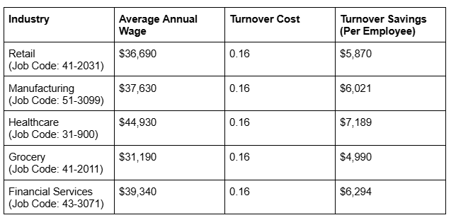 Average Annual Wage × Turnover Cost (0.16) = Turnover Savings Per Employee