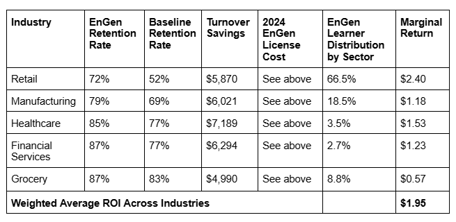 To ensure that our ROI calculations accurately reflect the employer data used in the analysis, we applied a weighted average based on the number of employees enrolled in EnGen across each industry sector. This approach gives proportionally greater influence to sectors with larger EnGen learner representation.