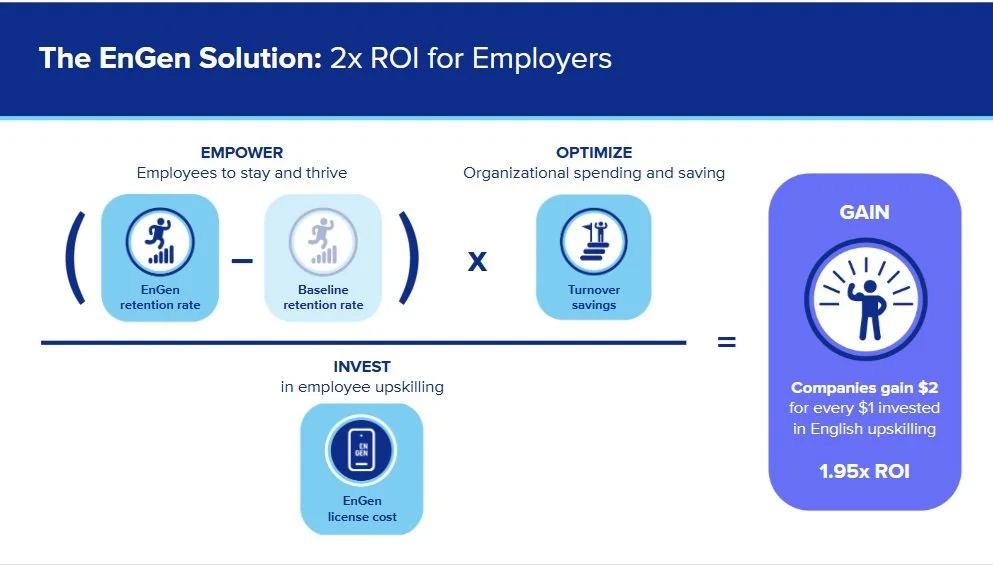 This analysis shows that workplace-based English instruction is paying for itself and more. Employers across industries are saving thousands per worker, with average returns of $1.95 for every $1 invested in EnGen.